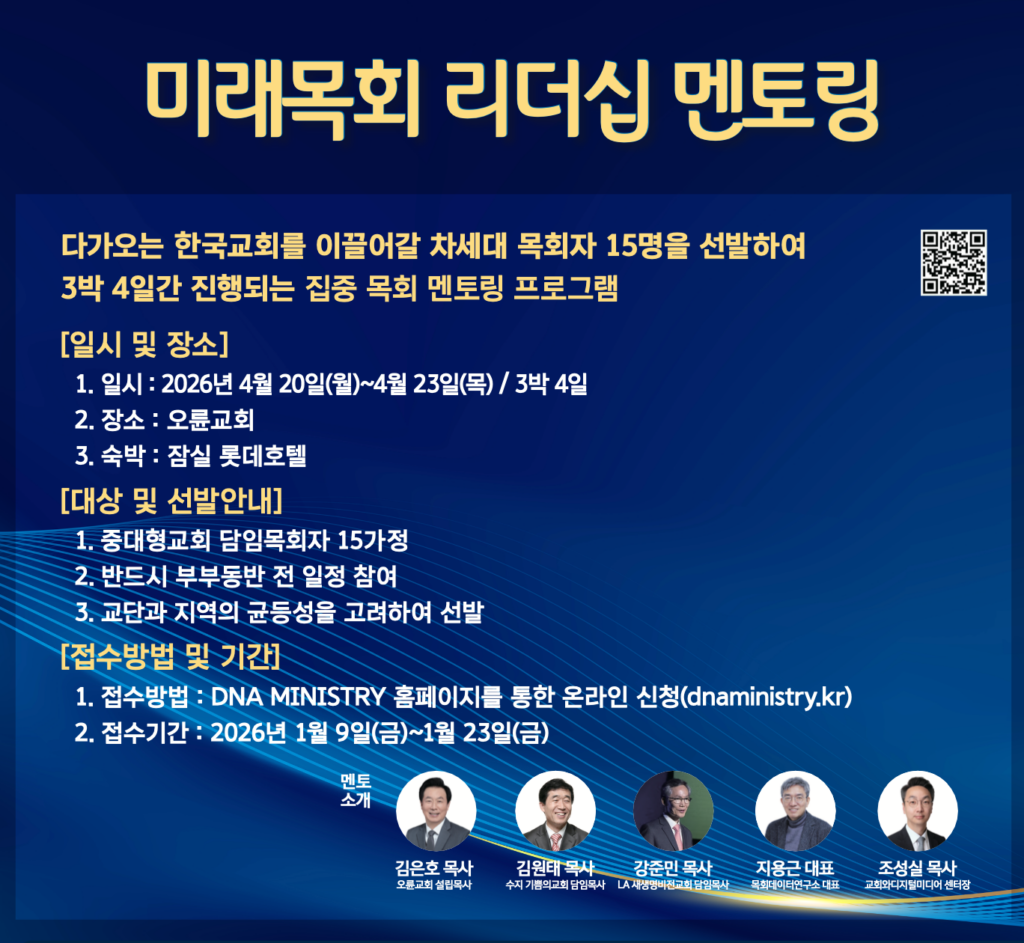 DNA MINISTRY에서 2025년도에 이어 차세대 목회자 부부를 위한 미래목회 리더십 멘토링을 진행합니다.