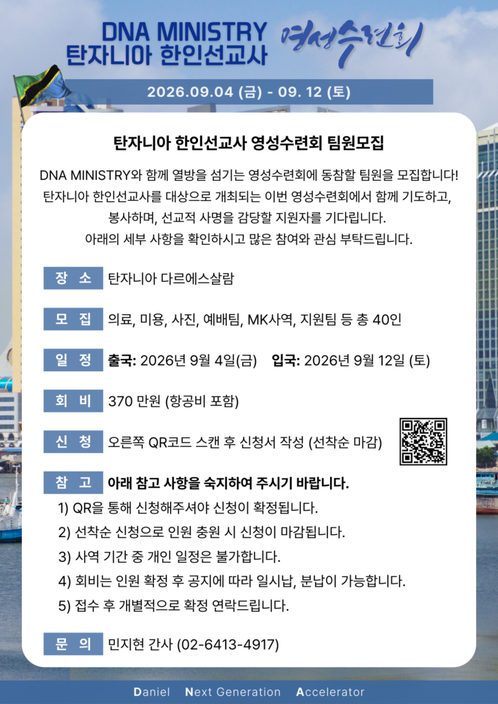 DNA MINISTRY와 함께 탄자니아 한인선교사 영성수련회를 섬기는 팀원을 모집합니다. QR코드 혹은 아래 링크를 클릭하여 신청하시기 바라며, 신청은 선착순 마감되오니 참고 부탁드립니다. 영성수련회 신청하기
